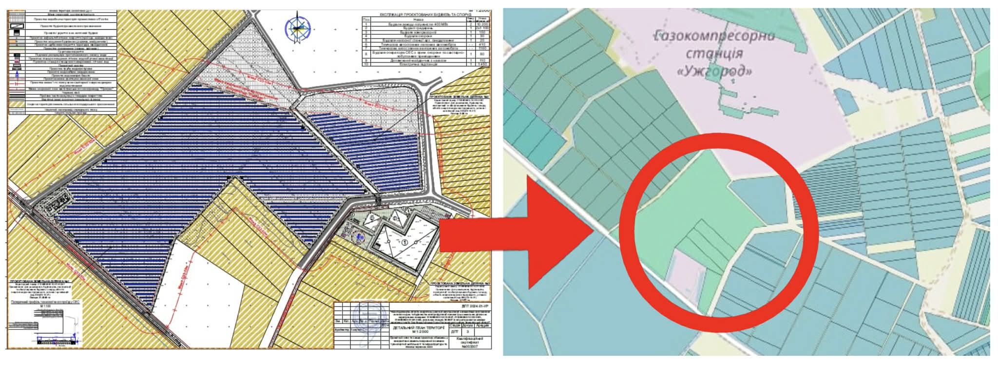 Про другий проєкт відомо більше: оприлюднені детальні плани та інформація про плановану діяльність. Під будівництво сонячної електростанції з елементами виготовлення зеленого водню та супутньої електропідстанції ТОВ «Соларгамма» отримало 28,9 га поля біля газокомпресорної станції «Ужгород» газопроводу «Уренгой – Помари – Ужгород». 21,2 та 5 га компанії відали у оренду і ще 2,7 га вона отримала у власність через свою власницю Наталію Гуріну.