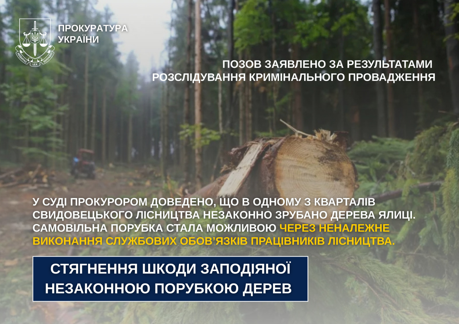 Господарський суд задовольнив позов заступника керівника Закарпатської обласної прокуратури та ухвалив рішення про стягнення з державного підприємства «Ліси України» 3,2 млн грн шкоди, завданої незаконною вирубкою дерев у Свидовецькому лісництві. Під час розслідування було встановлено, що в одному з кварталів лісництва здійснено самовільну порубку ялиці. Незаконна діяльність стала можливою через неналежне виконання службових обов’язків працівниками підприємства.