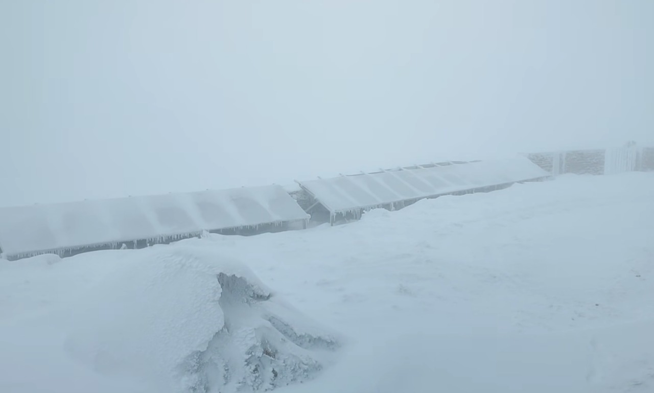 На вершині гори Піп Іван у Карпатах уже відчутно зиму. Температура повітря опустилася до -5°С, дме північний та північно-східний вітер 6–8 м/с, у поривах — до 12 м/с. Видимість обмежена, йде сніг, а замети подекуди сягають пів метра.
