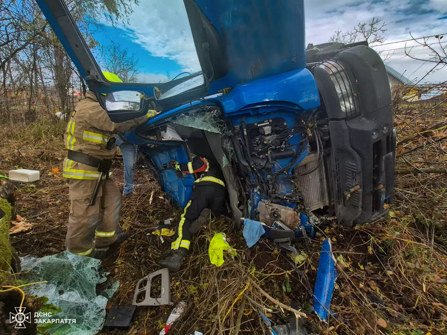 Сьогодні опівдні на трасі «Берегово–Мукачево», неподалік повороту на село Жнятино, сталася серйозна дорожньо-транспортна пригода. Бетонозмішувач марки Renault з’їхав з дороги та перекинувся у кювет. У кабіні опинився затиснутим 36-річний водій, який не міг вибратися самостійно. На місце події прибули рятувальники, які за допомогою сспеціального гідравлічного інструменту звільнили чоловіка з понівеченої кабіни. Далі постраждалого оглянула бригада екстреної медичної допомоги.