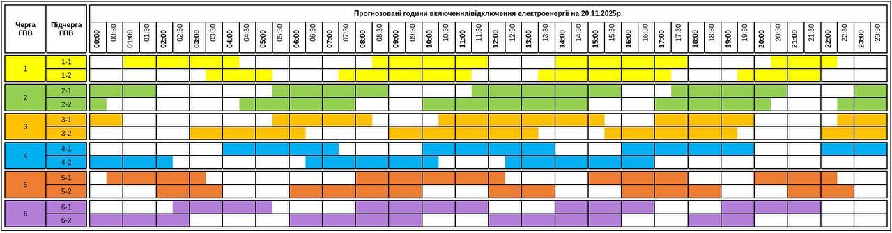 5 черга (5-1, 5-2): вимкнення триватимуть з 00:30 до 04:30, 09:30–13:00 та ввечері з 17:00 до 22:00.