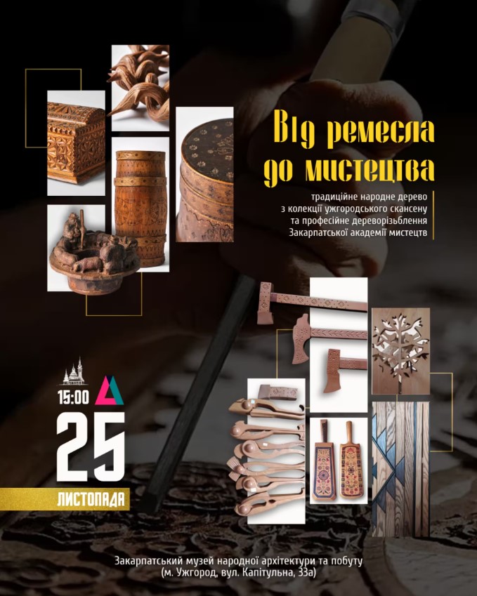 В Ужгороді 25 листопада відкриють виставку «Від ремесла до мистецтва: дерево як жива культурна спадщина». Її розгорнуть у верхній виставковій залі Закарпатського музею народної архітектури та побуту. Експозиція поєднає старовинні зразки народного дереворізьблення з музейної колекції та сучасні роботи студентів і викладачів Закарпатської академії мистецтв.