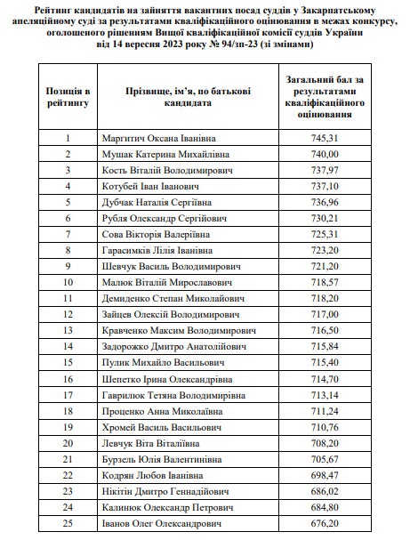 Список переможців конкурсу на зайняття вакантних посад суддів у Закарпатському апеляційному суді в межах конкурсу, оголошеного рішенням Вищої кваліфікаційної комісії суддів України від 14 вересня 2023 року № 94/зп-23 (зі змінами):