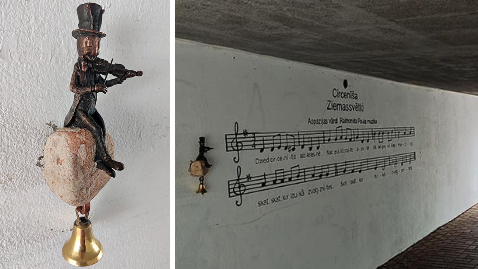 Цвіркун у циліндрі грає на скрипці, а нотний ряд присвячений відомій латвійській різдвяній пісні.