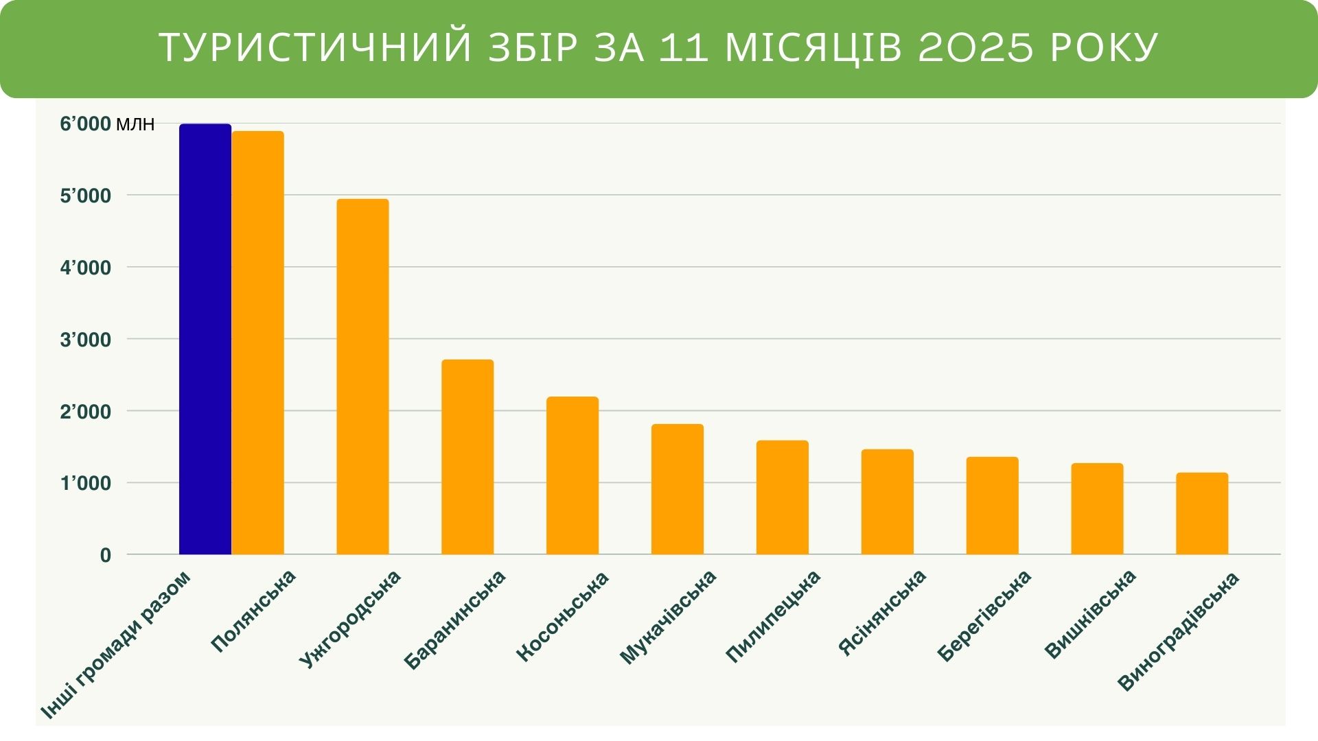 За 11 місяців 2025 року на Закарпатті сплатили понад 30 млн грн туристичного збору. Це на 35% більше, ніж за аналогічний період минулого року. За даними податкової, турзбір від фізичних осіб-підприємців становив 17,5 млн грн, а від юридичних осіб — понад 12,8 млн грн. Найбільші надходження туристичного збору отримали громади: