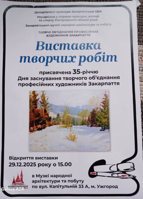 Відкриття експозиції відбудеться у понеділок, 29 грудня, о 15:00, у виставкових залах першого поверху Закарпатського музею народної архітектури та побуту (вул. Капітульна, 33а). Ювілейна експозиція об’єднає твори понад 30 митців, які впродовж десятиліть формували та розвивали образотворче й декоративно-прикладне мистецтво Закарпаття. У двох виставкових просторах музею буде представлено олійний живопис, акварелі, а також твори декоративно-прикладного мистецтва. Усі роботи поєднані любов’ю до Закарпаття — Срібної Землі у центрі Європи, її природи, історії та духовної спадщини. Виставку присвячено світлій пам’яті багатолітнього голови Товариства, заслуженого художника України Василь Брензович, який відійшов у вічність 23 грудня 2025 року.