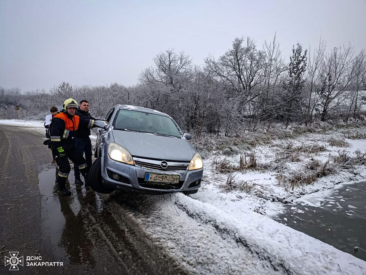 Перший випадок стався на вулиці Прикордонній. Через снігопад та ожеледицю автомобіль Opel Astra з’їхав на узбіччя та завис на бордюрі над каналом Верке. Про ДТП повідомив начальник караулу, який перебував поза службою. До прибуття підрозділу ДСНС він допомагав водійці утримувати автомобіль, аби не допустити його перекидання.