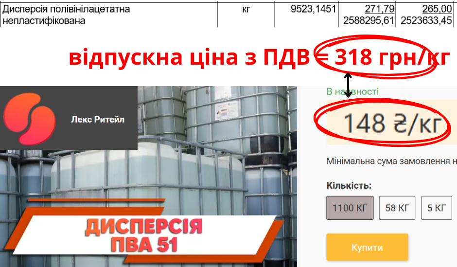 У інформації про ціни на матеріальні ресурси полівінілацетатну непластифіковану дисперсію врахували по 318 грн/кг. «Дивоцвіт» продає її по 146 грн/кг, а «Лекс Ритейл» по 148 грн/кг, що вдвічі дешевше.