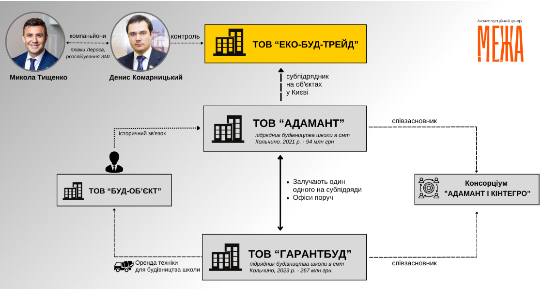 Антикорупційний центр «Межа» повідомляв, що компанія «Гарантбуд» пов’язана бізнесменом-втікачем Денисом Комарницьким та нардепом Миколою Тищенком. Раніше вона була зареєстрована у Києві. Та була перереєстровано у Кольчино, коли Тищенко став керівником Закарпатської обласної організації партії «Слуга народу».