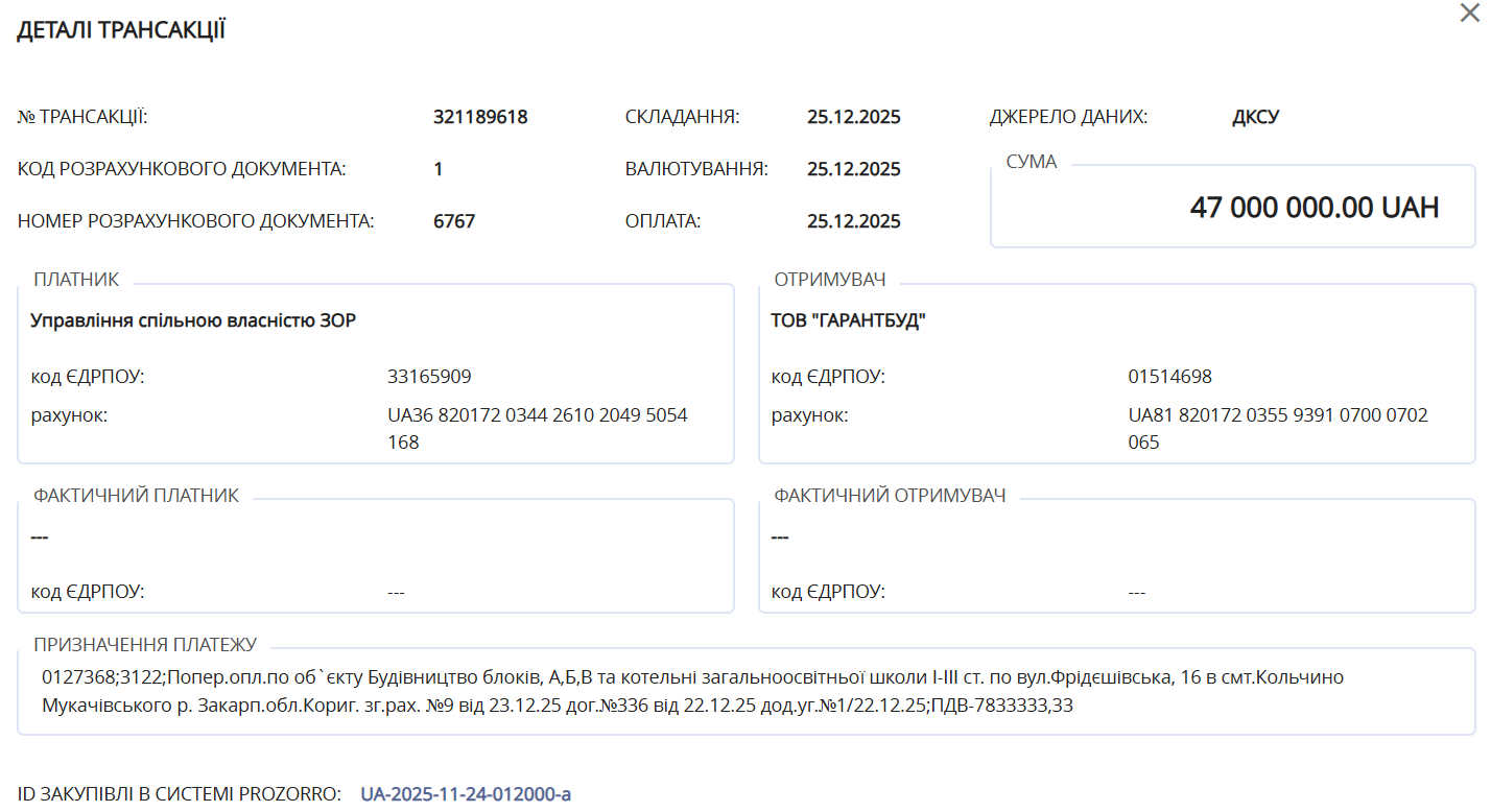 За нинішнім договором в останній тиждень 2025 року мали виконати роботи на суму 67,20 млн грн з загальної вартості чверть мільярда гривень. При цьому угода дозволяла підряднику отримати аванс у розмірі до 70% від річного фінансування. Відтак, за даними порталу «Spending», 25 грудня «Гарантбуду» перерахували авансом 47,00 млн грн.