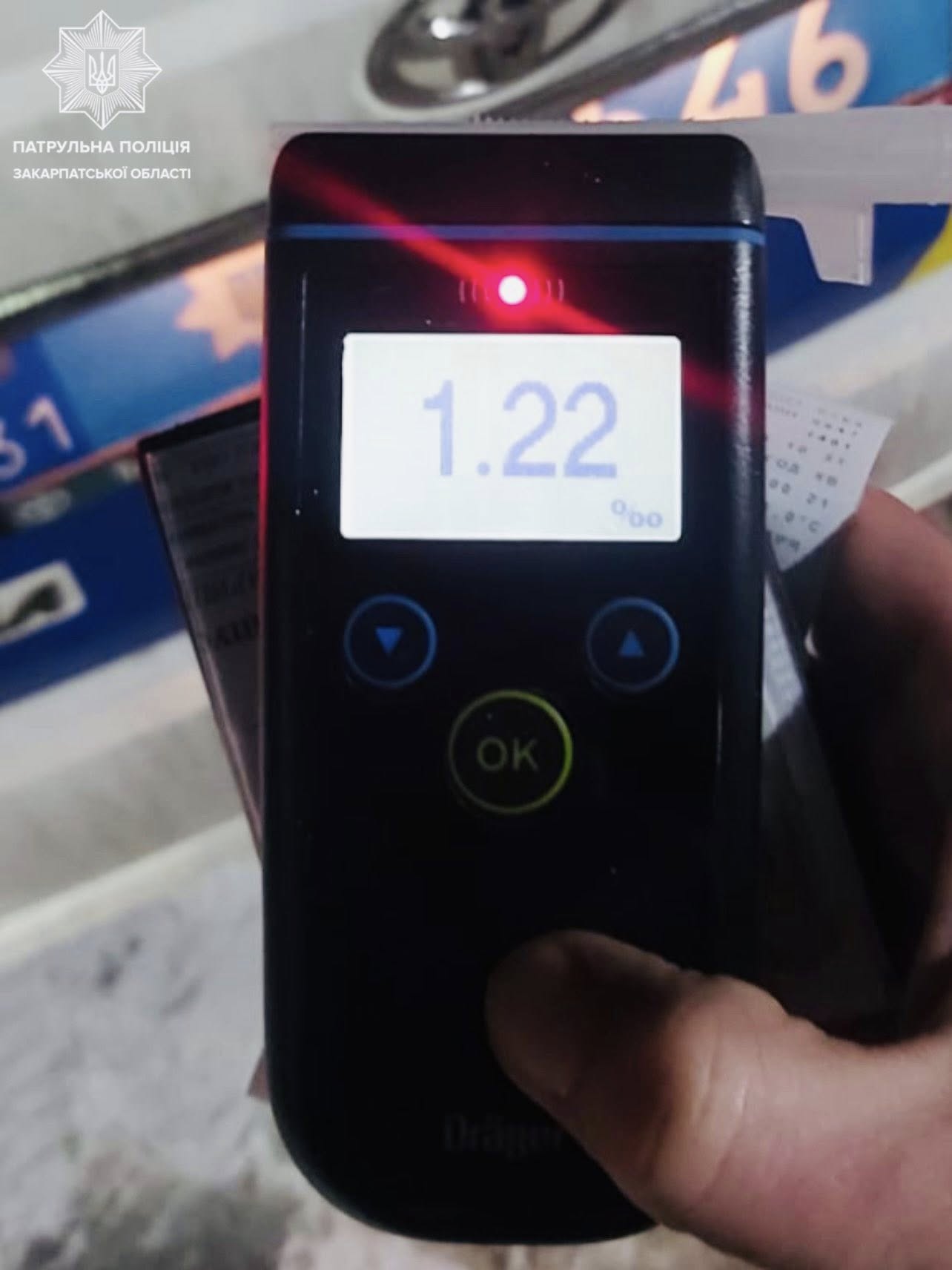 Огляд на стан алкогольного сп'яніння водій пройшов на місці зупинки. Результат — 1,22 ‰.