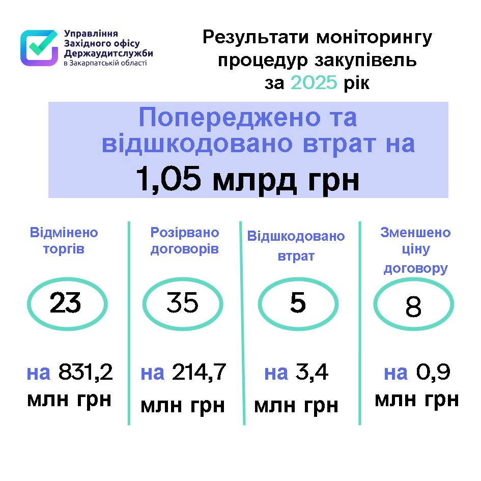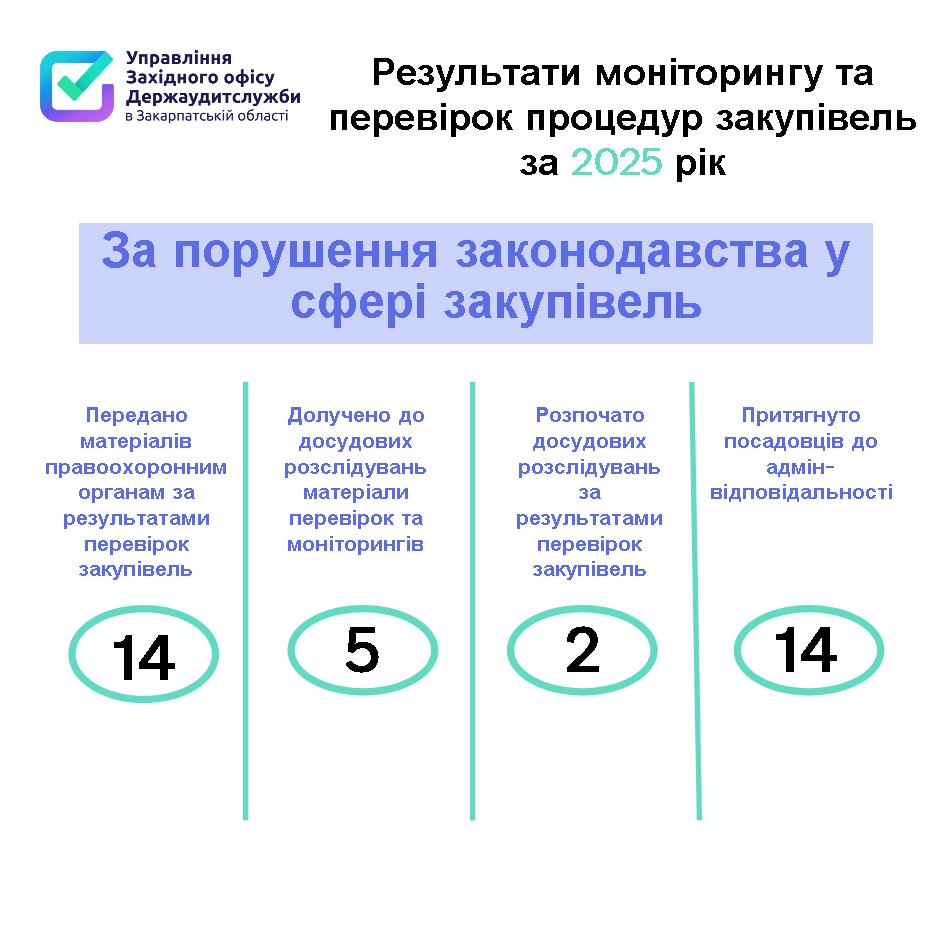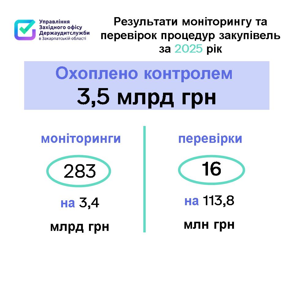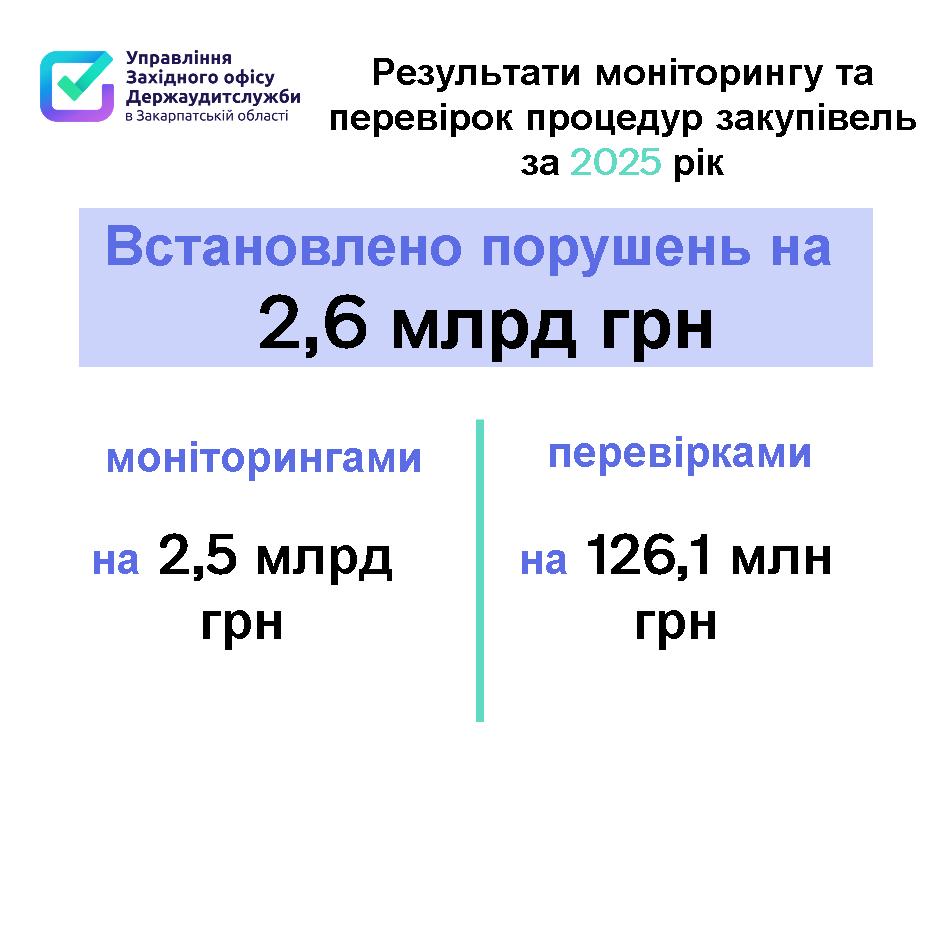 Закупівлі загальною вартістю понад 3,5 мільярда гривень охопили контролем працівники Управління Західного офісу Держаудитслужби в Закарпатській області впродовж 2025 року і виявили порушення законодавства на суму більш ніж 2,6 мільярда гривень. Порушень, які призвели до фінансових та матеріальних втрат зафіксували на 2,8 мільйона гривень.
