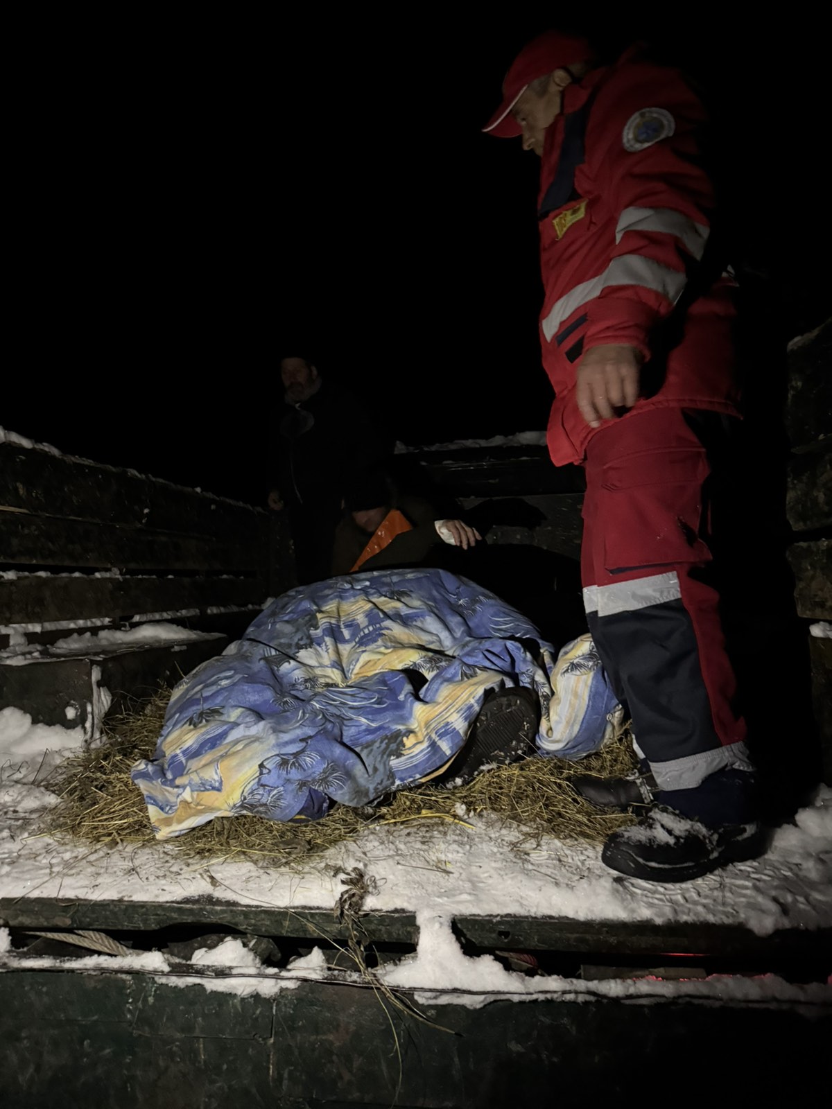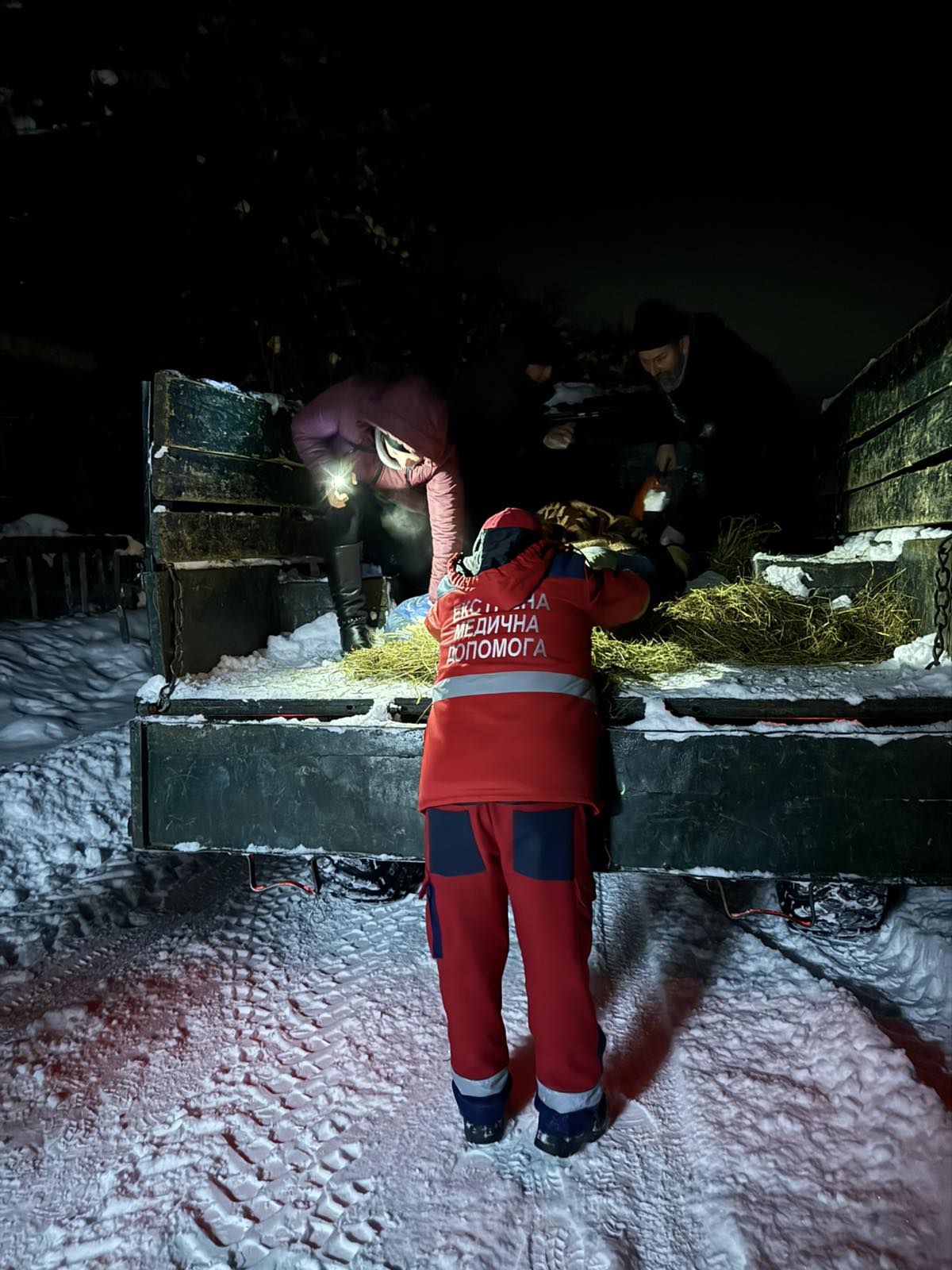 На місці медики провели огляд, надали знеболення, обробили опіки та підготували чоловіка до транспортування. Евакуація відбувалася у складних умовах — пацієнта на ношах піднімали вгору по глибокому снігу. Далі його доправили вантажівкою до карети швидкої допомоги та транспортували до лікарні. Загалом транспортувально-рятувальна операція тривала майже чотири години.