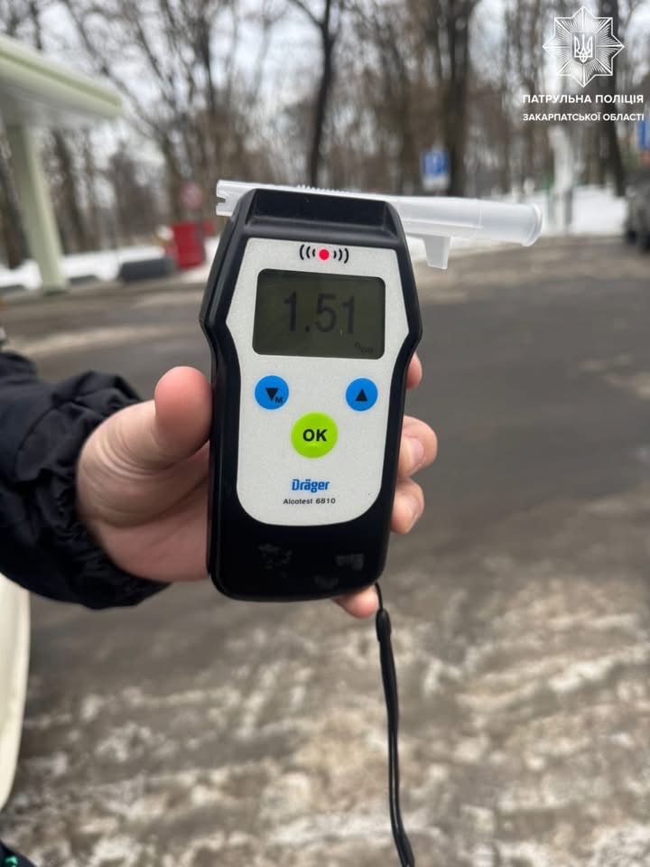 Водій погодився пройти огляд на стан сп’яніння на місці зупинки. Результат тесту показав 1,51 проміле алкоголю.