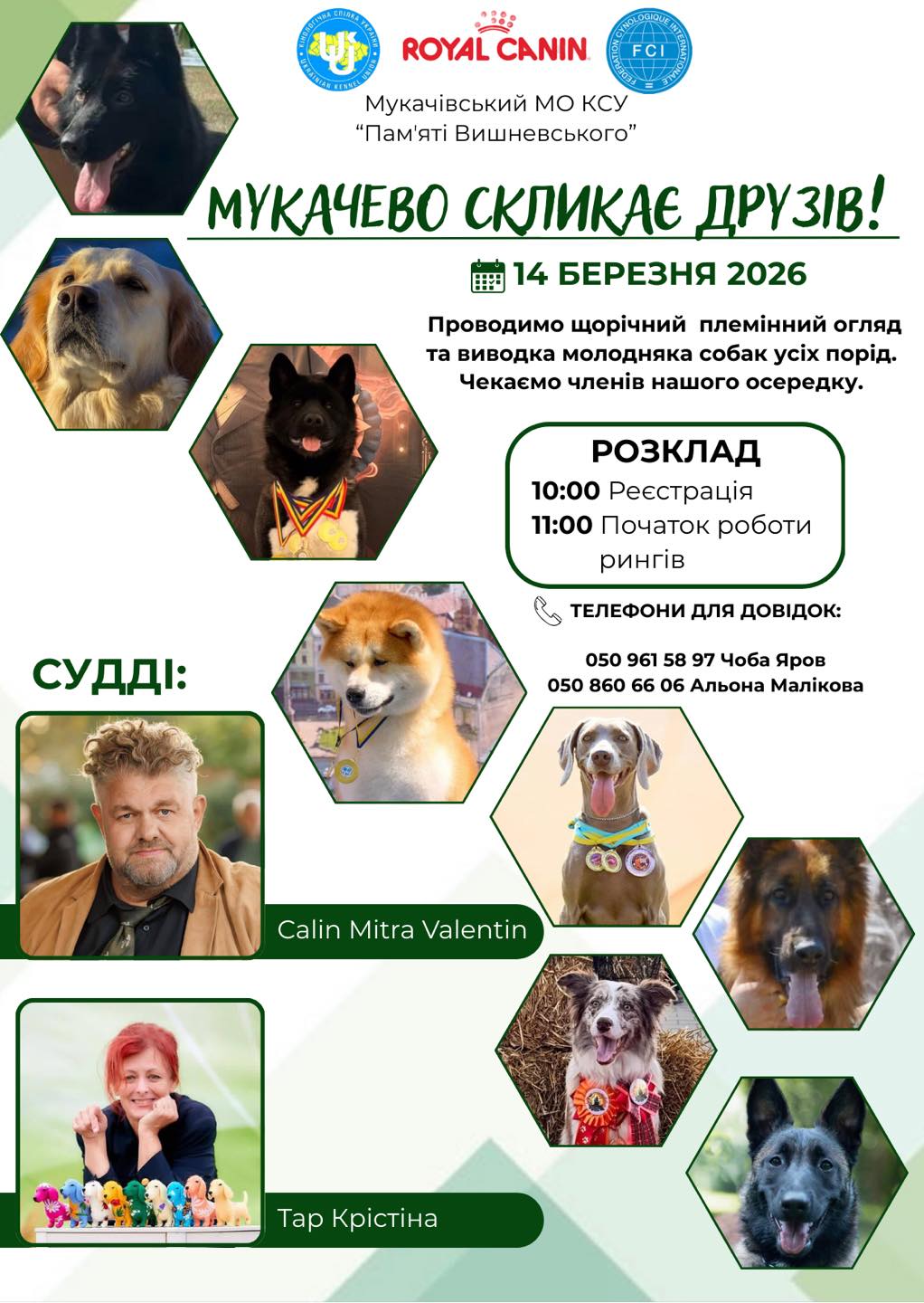 Уже завтра, 14 березня, у Мукачеві відбудеться щорічний племінний огляд та виводка молодняка собак усіх порід. Захід організовує Мукачівський місцевий осередок Кінологічної спілки України «Пам’яті Вишневського».