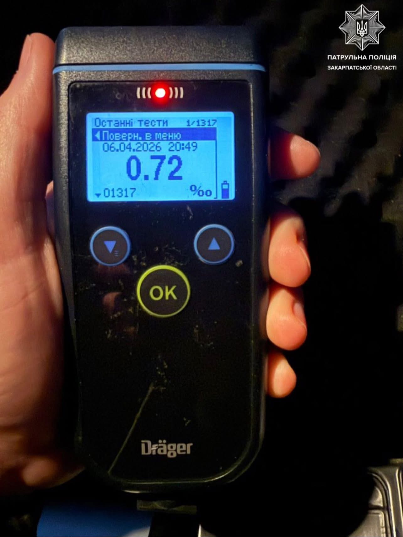 Чоловікові запропонували пройти огляд на місці зупинки. Результат тесту показав 0,72 проміле алкоголю в крові.