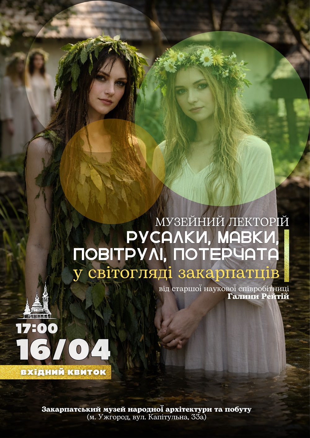 У четвер, 16 квітня, о 17:00, Закарпатський музей народної архітектури та побуту (м. Ужгород, вул. Капітульна, 33а) запрошує до малої виставкової зали на тематичну лекцію, присвячену демонологічним персонажам народної культури Закарпаття. У її межах говоримуть про походження та локальні особливості образів русалки, мавки, повітрулі, потерчати, про їхню роль у традиційному календарному циклі та обрядовості, а також про трансформацію народних вірувань у сучасному культурному просторі. Докладно про це розповість старша наукова співробітниця музею Галина Рейтій.